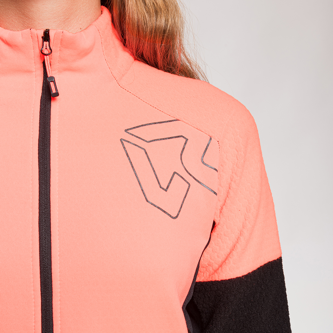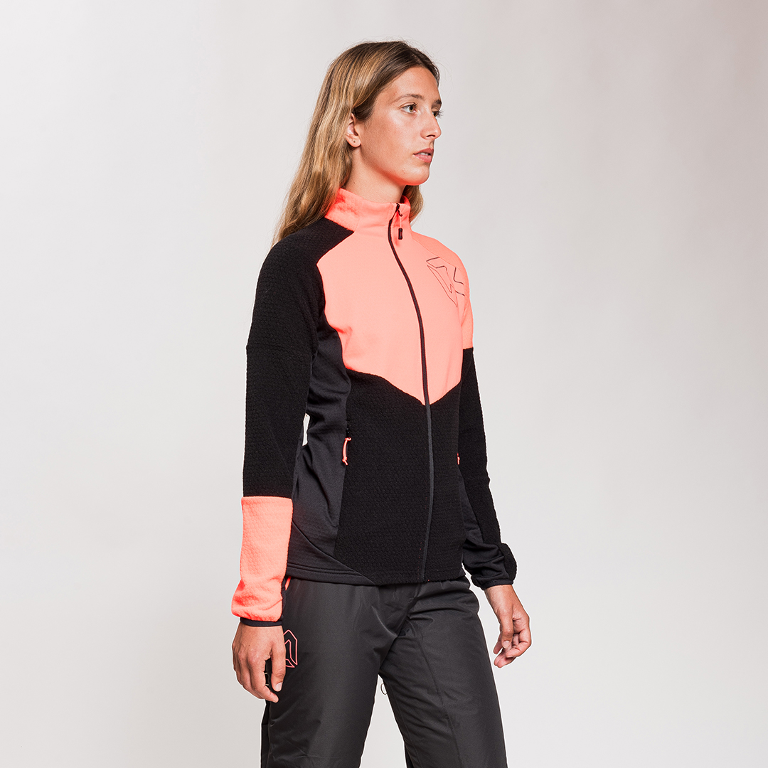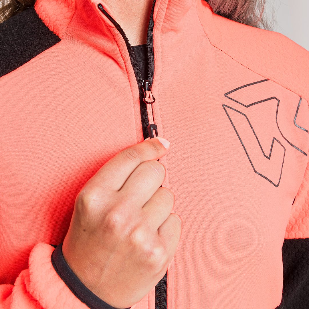 Edna è un pile a motivo esagonale in rilievo, sia interno che esterno al capo, per intrappolare il calore e allontanare l'umidità. Le cuciture sono piatte per evitare spessori e un nastro in lycra sul fondo manica lascia il pile sempre aderente al corpo.