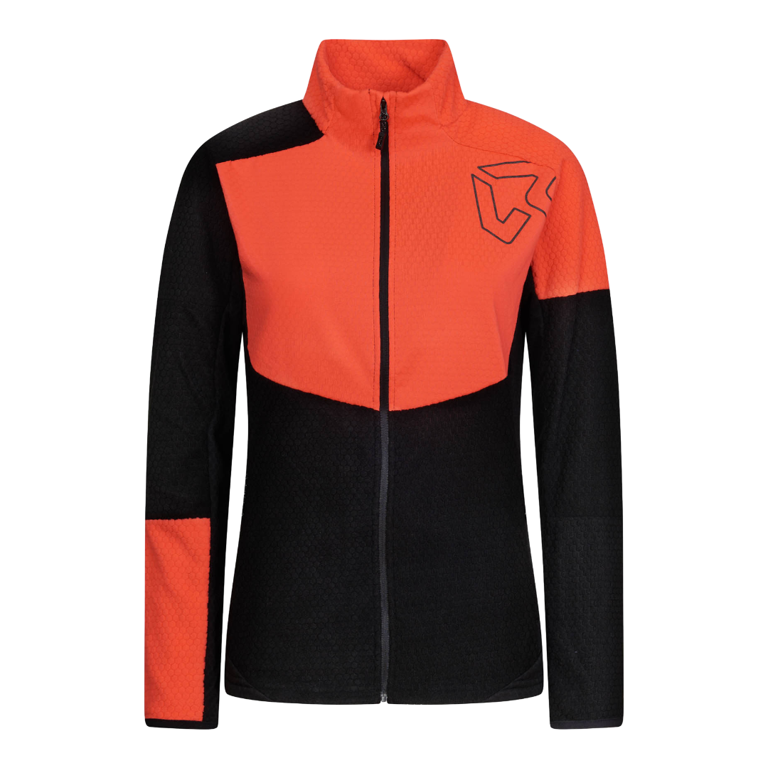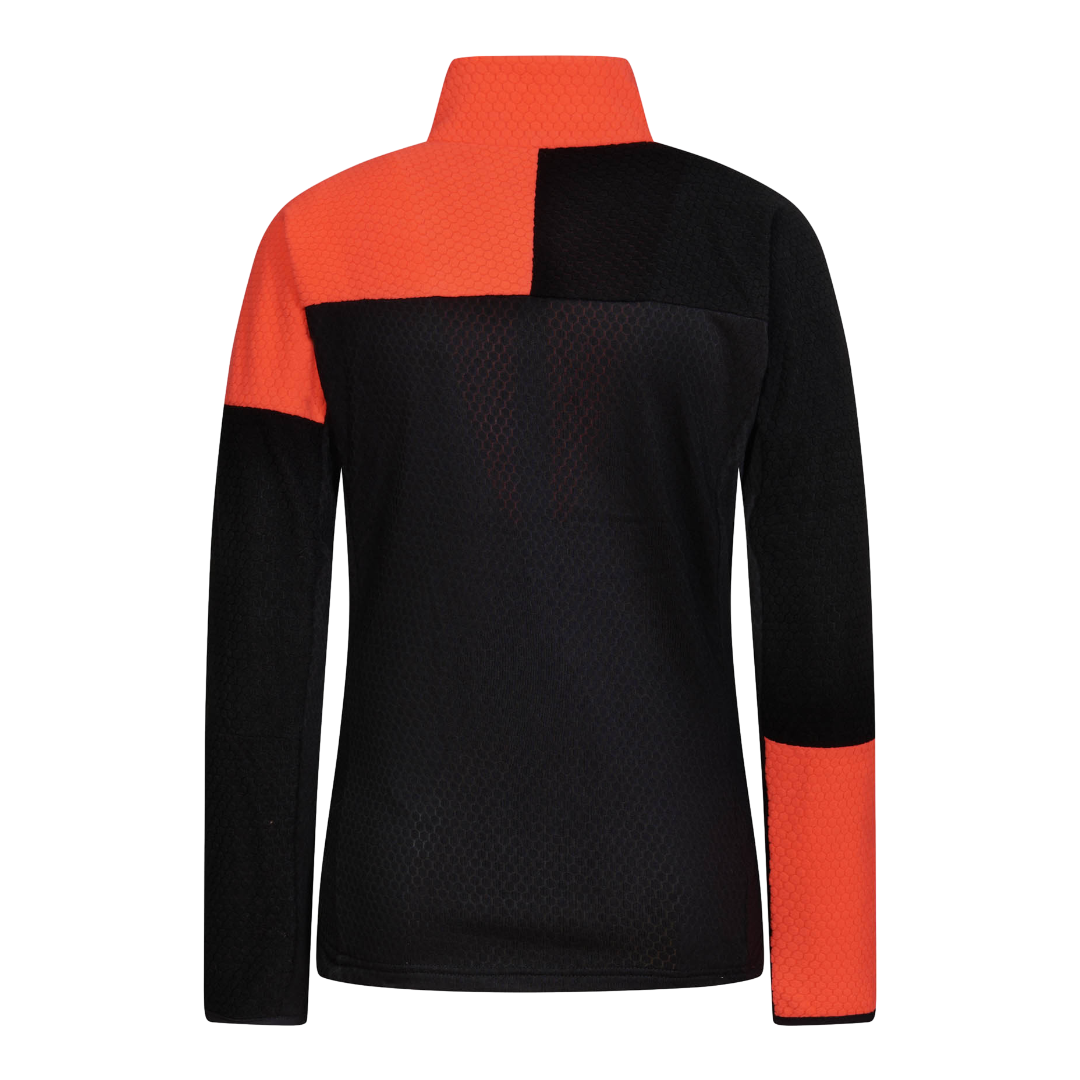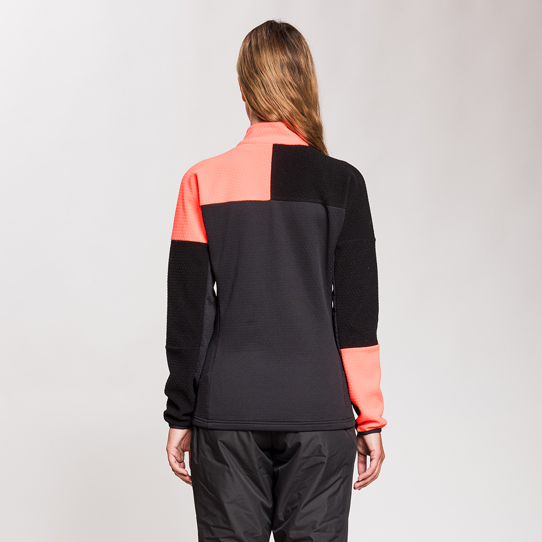 Edna è un pile a motivo esagonale in rilievo, sia interno che esterno al capo, per intrappolare il calore e allontanare l'umidità. Le cuciture sono piatte per evitare spessori e un nastro in lycra sul fondo manica lascia il pile sempre aderente al corpo.