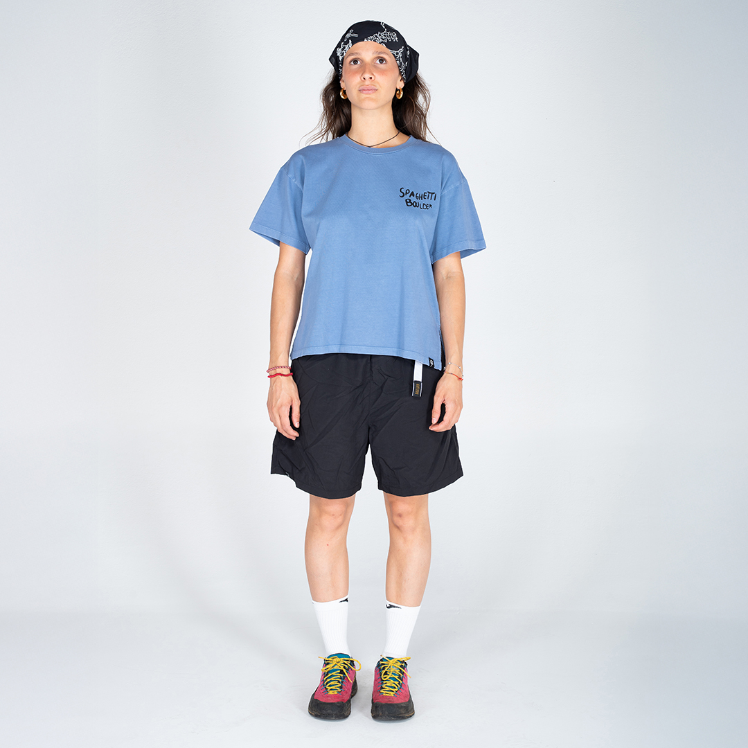 Con Spaghetti Boulder, in cui si legge un omaggio sia all’Italia sia all’outdoor, si crea un parallelismo moderno e concettuale con “Spaghetti Western”, espressione nata negli Stati Uniti d’America, che indica i lungometraggi girati in italiano, oggi veri e propri cult, associato al boulder contemporaneo. «Abbiamo scelto questo nome proprio per enfatizzare l’idea di una Italian boulder culture. La nostra penisola non solo conta numerose zone iconiche per l’arrampicata ma è anche la culla di arrampicatori oggi diventati leggende. La moderna concezione di questo sport, la naturale predisposizione e l’offerta del nostro territorio hanno acceso i riflettori sull’Italia. Oggi, infatti, la voglia di integrazione sia nel tessuto nazionale che nella cultura made in Italy del turismo sportivo è sempre più presente e costante, anche per questo, la nostra visione, non solo di business, si concentra su questo punto cardine. L’idea di poter indossare un concetto, un’identità e una cultura è stata la nostra fonte di ispirazione e principale obiettivo di questa capsule collection». Spaghetti Boulder non vuole semplicemente rappresentare l’arrampicata, vuole essere un vero e proprio stile di vita. Il sogno di poter miscelare le discipline sportive dell’outdoor, tra cui anche skateboard e surf, con la lifestyle ad esse associata, è oggi una realtà sotto un marchio completo e innovativo
