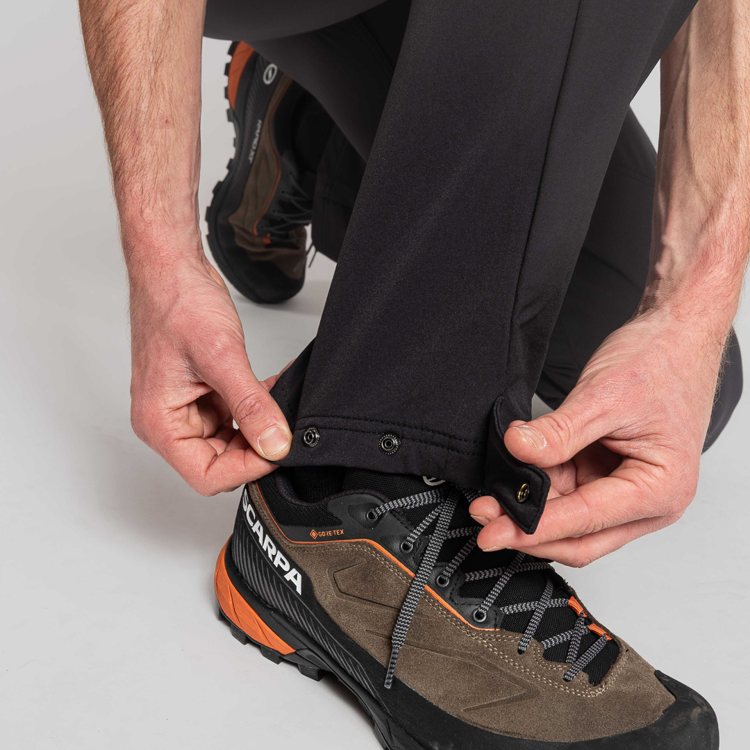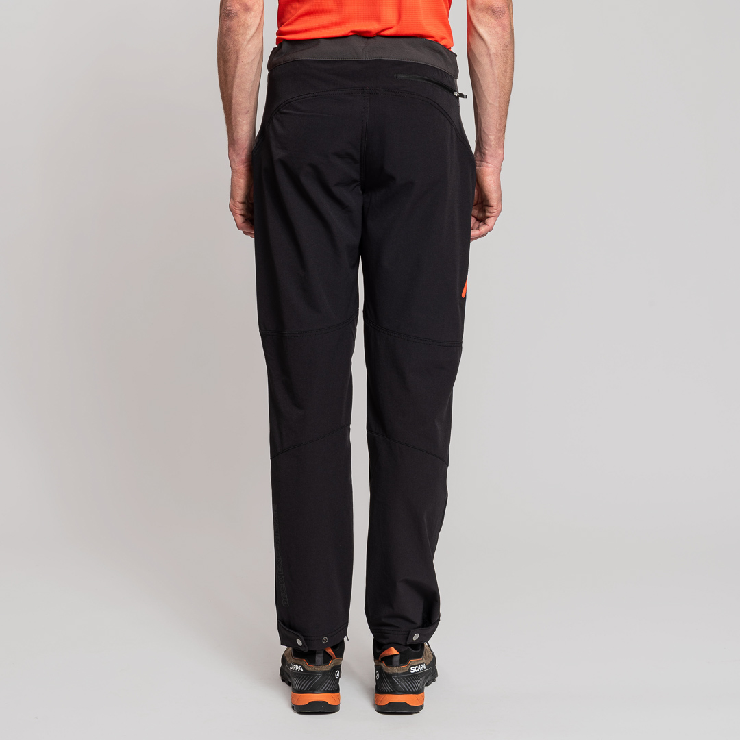 Il posizionamento della tasca sulla gamba è appositamente studiato per essere adatto anche indossando l’imbracatura e i cursori autobloccanti personalizzati garantiscono la chiusura delle zip durante tutte le attività. Il fondo gamba di Labyrinthus è regolabile per mezzo di bottoni a pressione. Completano il capo stampe riflettenti con il logo Rock Experience.