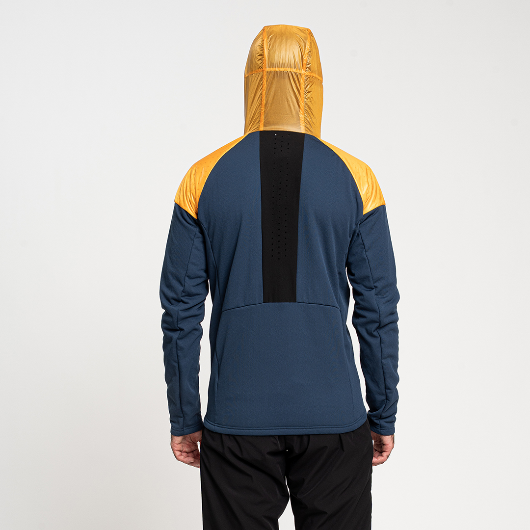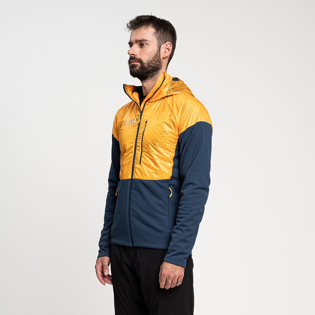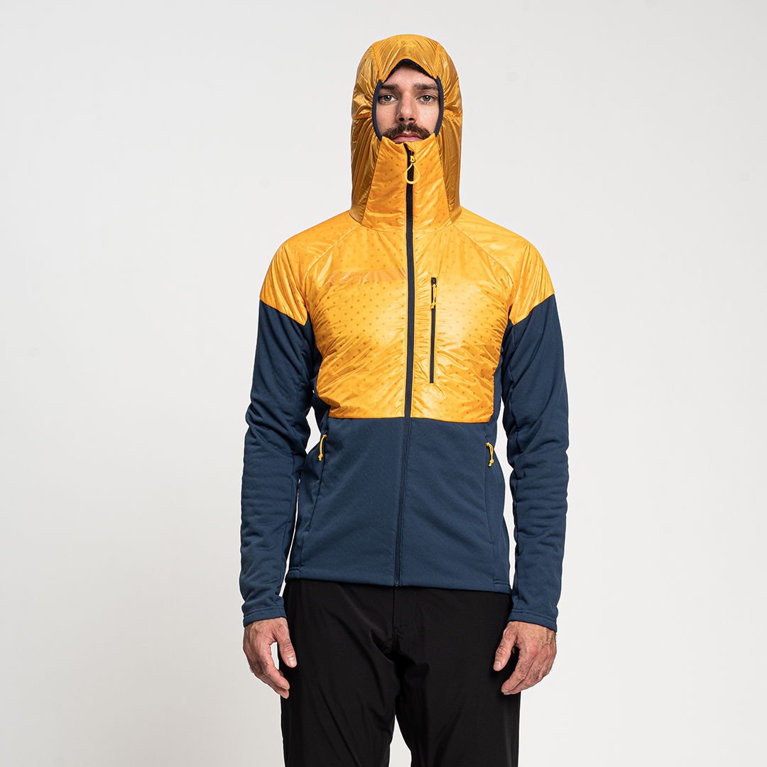 - Giacca ibrida progettata con materiali performanti e costruzione body mapping per ottimizzare traspirabilità, leggerezza, termoregolazione e calore.