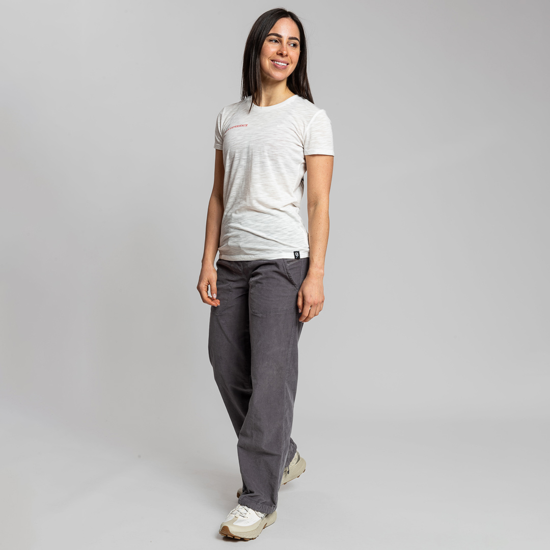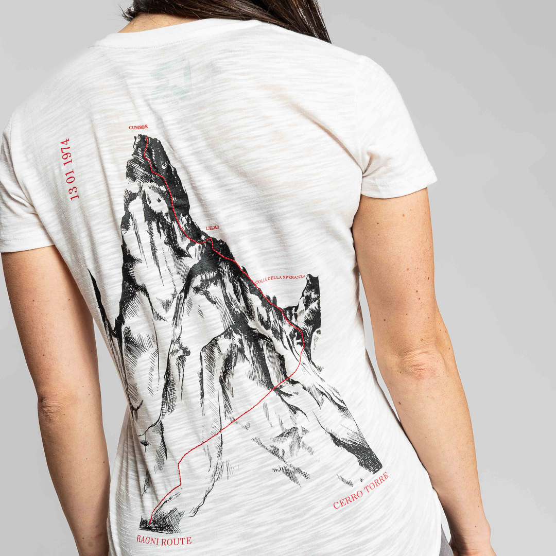 La maglietta Anniversary SS, realizzata in cotone biologico, celebra il 50° anniversario della prima scalata della via dei Ragni di Lecco sul Cerro Torre in Patagonia nel 1974, una delle più straordinarie formazioni di ghiaccio al mondo.