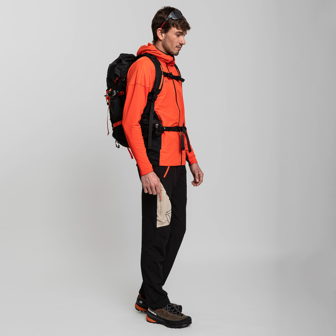 Questo capo è realizzato con la tecnologia GRID FLOW SYSTEM della SYNCRO LINE. La struttura a griglia migliora la ventilazione e regola il microclima corporeo, offrendo leggerezza, protezione e comfort duraturo durante ogni attività outdoor.