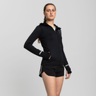 Il cappuccio, il fondo e le maniche inferiori sono rifiniti con nastro in lycra, assicurando una vestibilità aderente e senza restrizioni. La zip con cursore autolock garantisce una chiusura rapida e sicura durante i movimenti intensi.