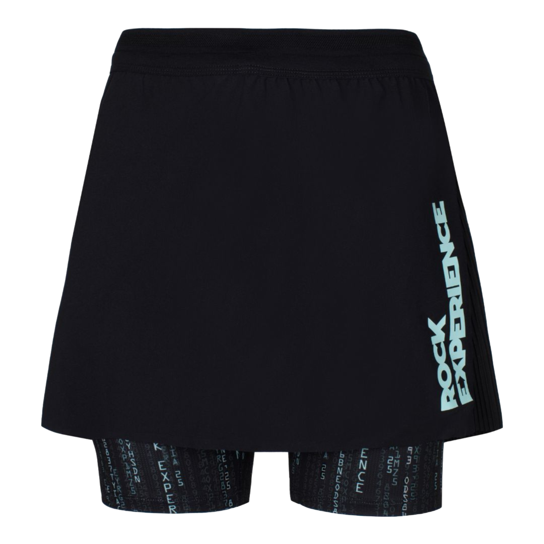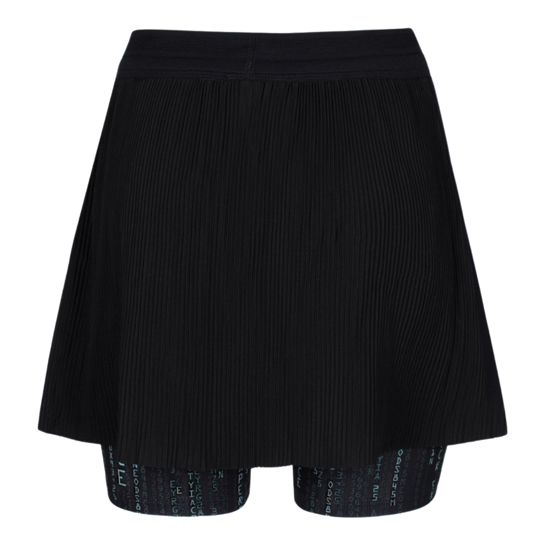 La gonna Purple Haze P. presenta un design distintivo con stampa interna e la combinazione di due tessuti: tessuto leggero elasticizzato sul davanti e tessuto plissettato sul retro. La costruzione leggera è realizzata attraverso tagli al laser e parti incollate. La cintura elastica tubolare con coulisse interna piatta permette la regolazione della vita.