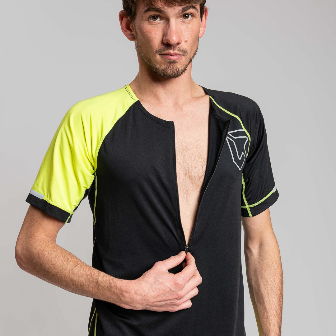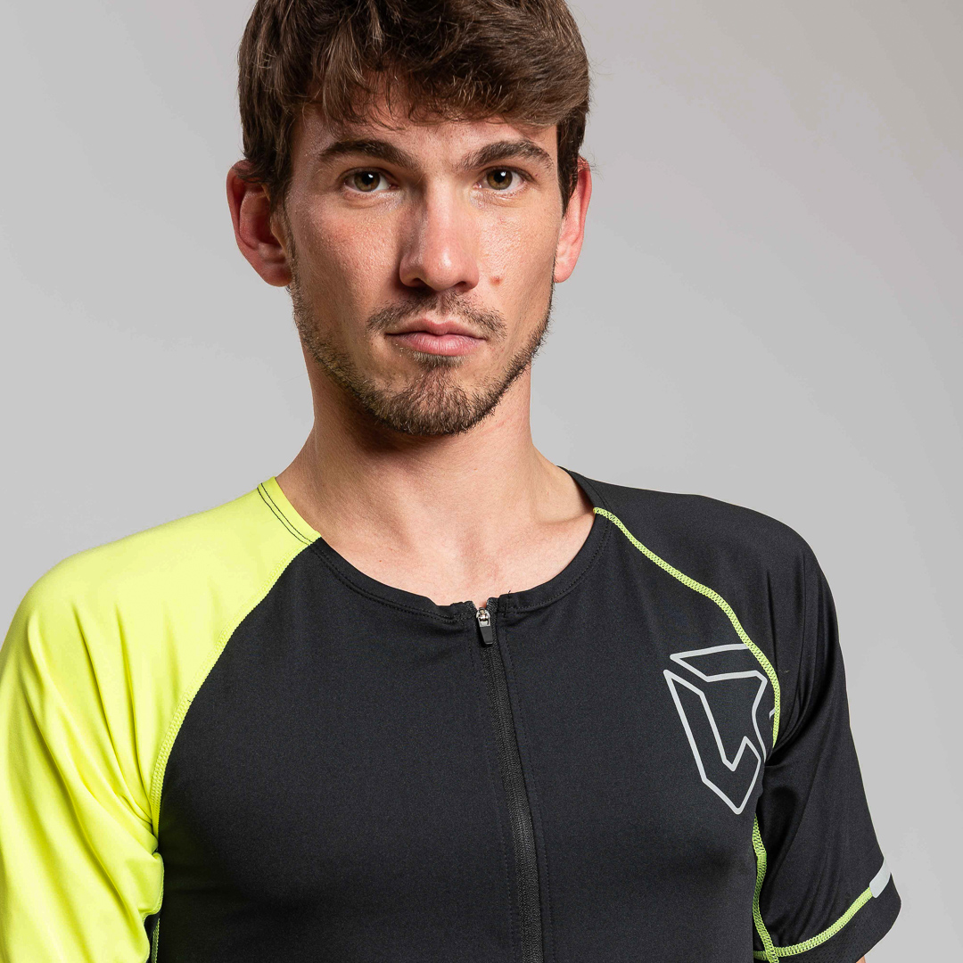 Disponibile in versione con o senza zip frontale su metà lunghezza, per una ventilazione personalizzata. I loghi e dettagli riflettenti migliorano la visibilità durante le uscite serali o all’alba.