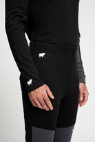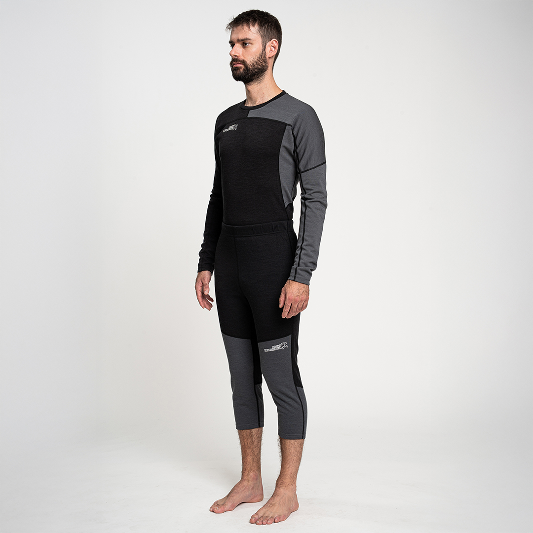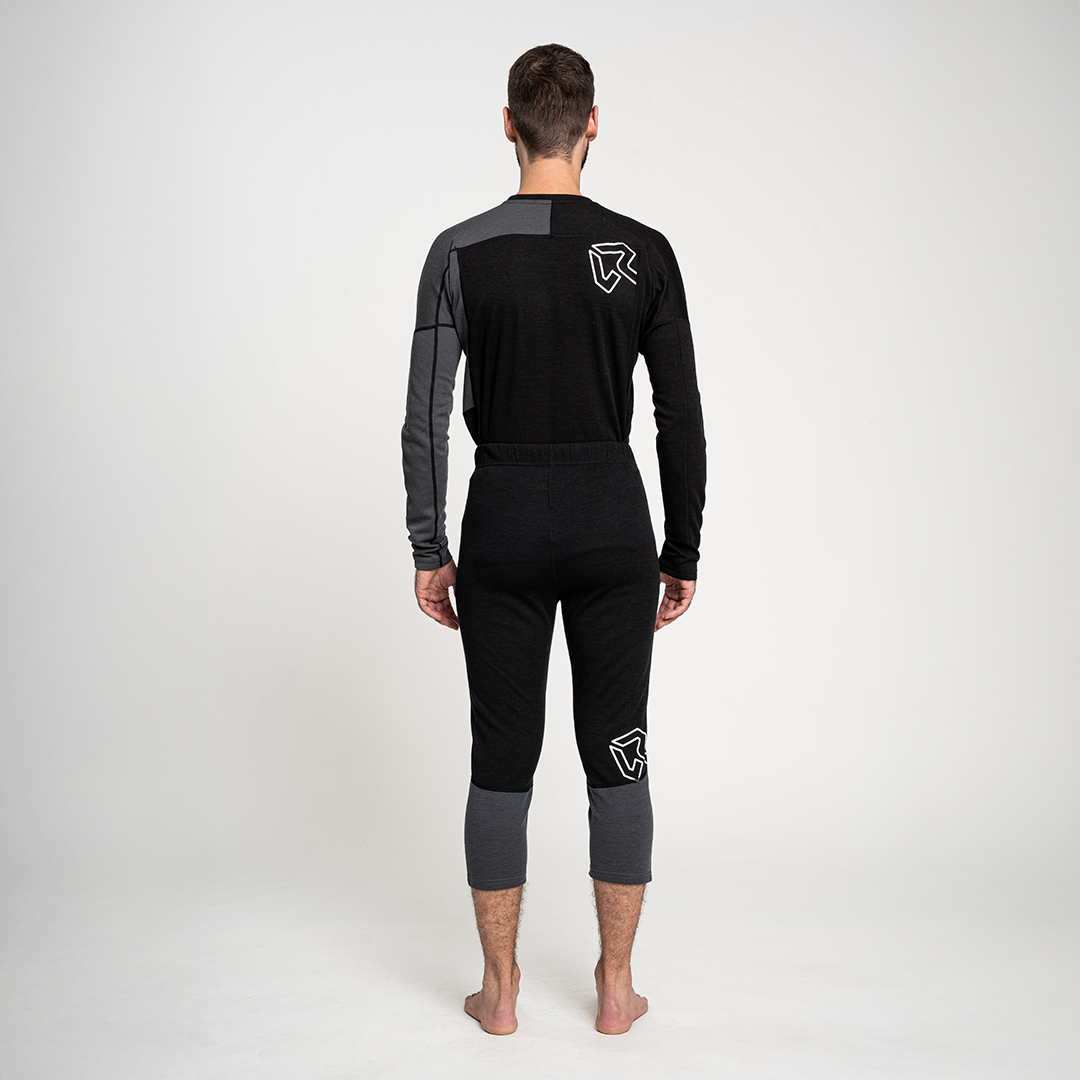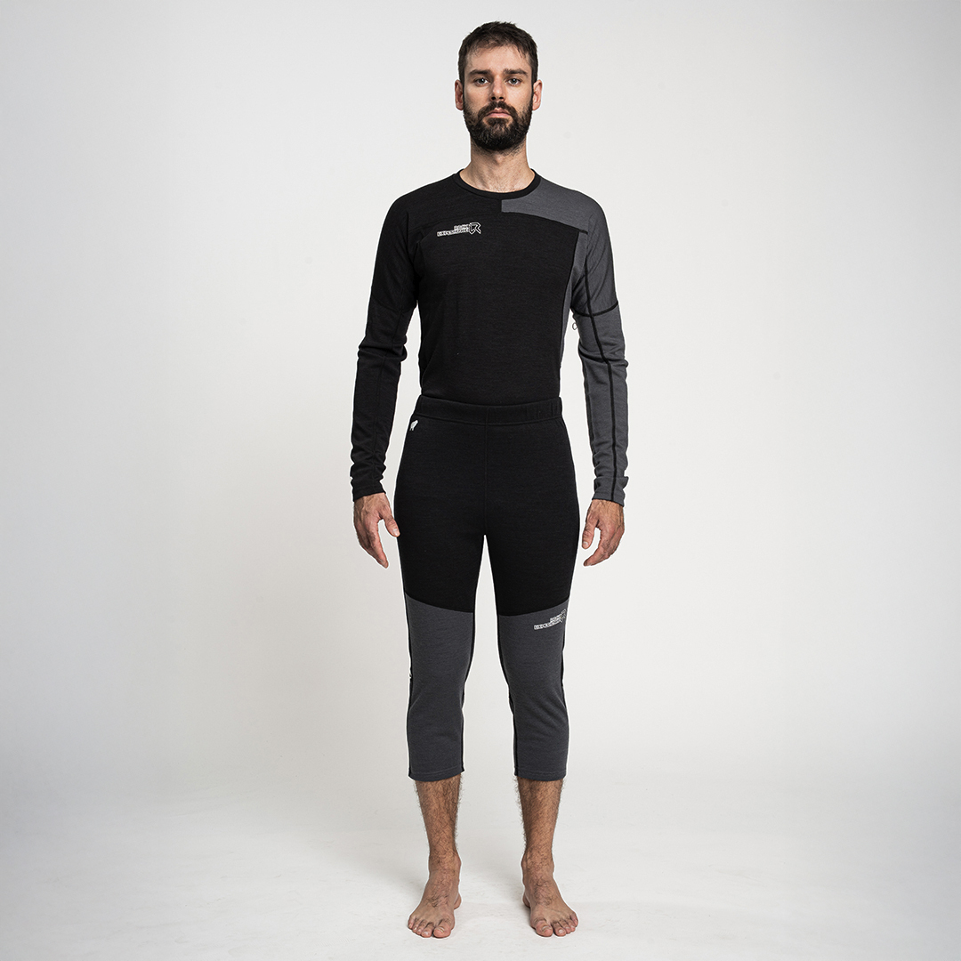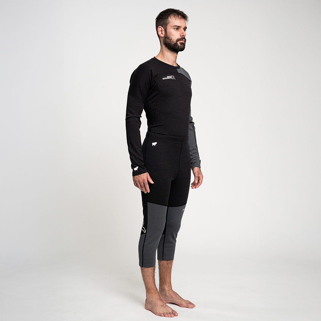 Realizzati in un tessuto misto composto da 50% lana merino e 50% poliestere riciclato, offrono calore, traspirabilità e asciugatura rapida. La lana merino, particolarmente morbida e piacevole a contatto con la pelle, trasporta efficacemente l’umidità verso l’esterno, mantenendo il corpo asciutto e caldo anche durante l’attività intensa.