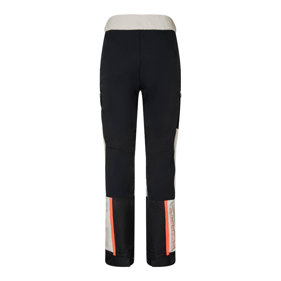 La parte inferiore delle gambe è rinforzata con tessuto resistente all’usura. Le ghette integrate, ridotte, hanno elastico interno per aderire perfettamente, mentre la patta inferiore ha due bottoni a pressione per adattarsi allo scarpone. Compatibili con bretelle.