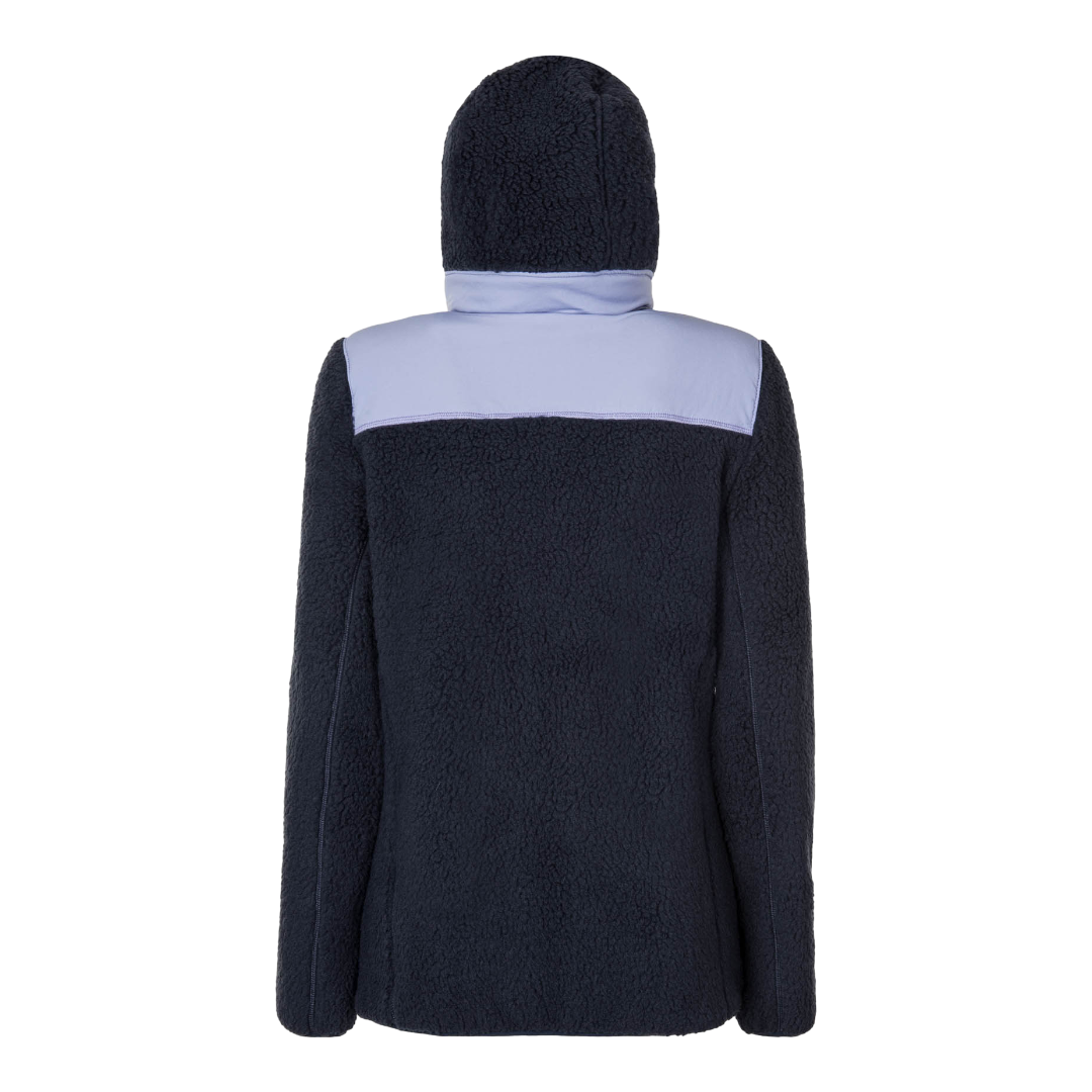 Pile sherpa vintage con rinforzo e tessuto tecnico antivento su collo e bordini delle tasche in vita. Nastro in lycra sui lati della zip principale, cappuccio, fondo capo e fondo manica. Cuciture piatte per evitare spessore lungo la cucitura. Personalizzazione con patch logo mountain.