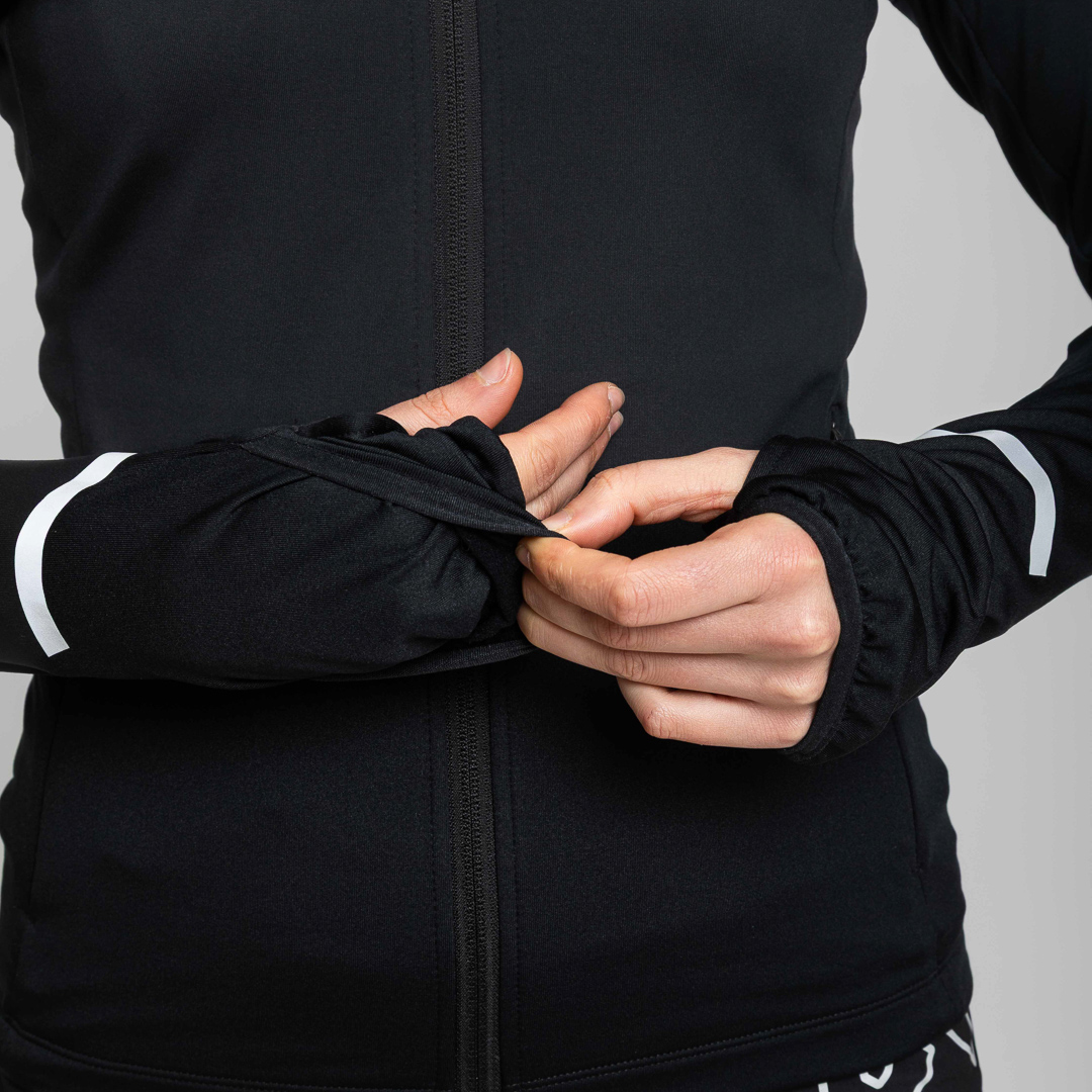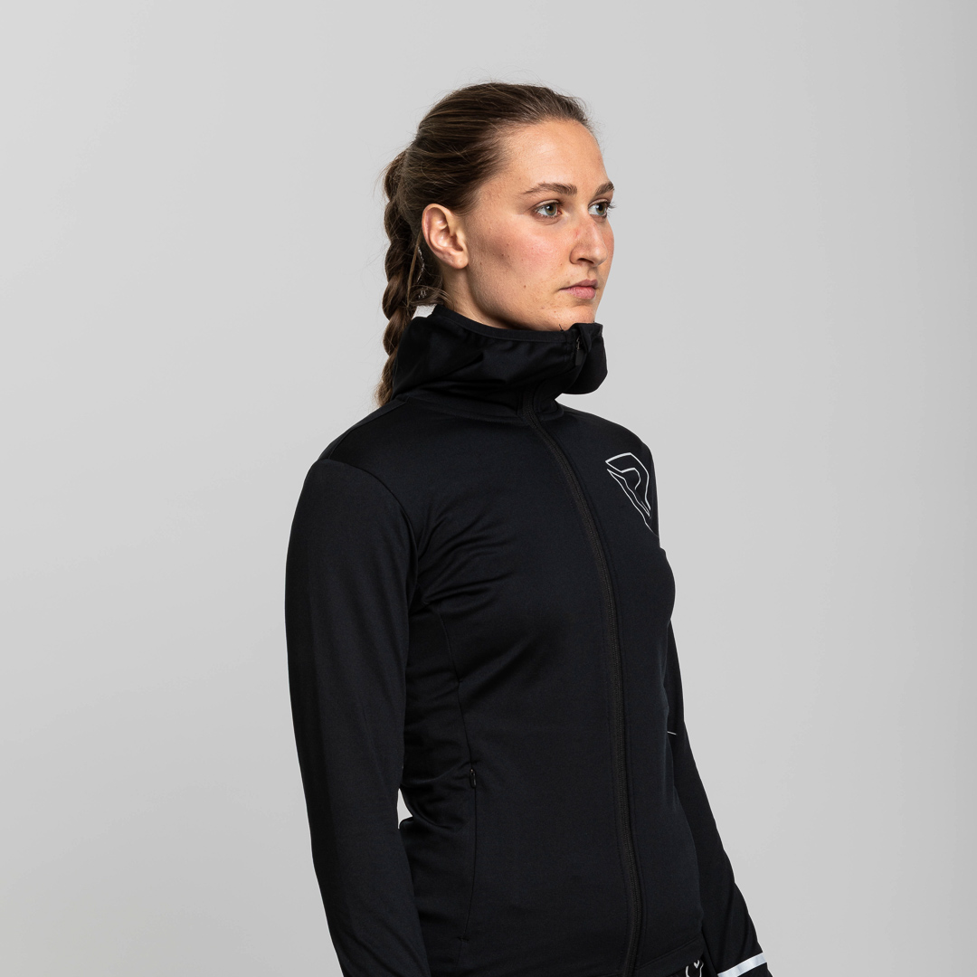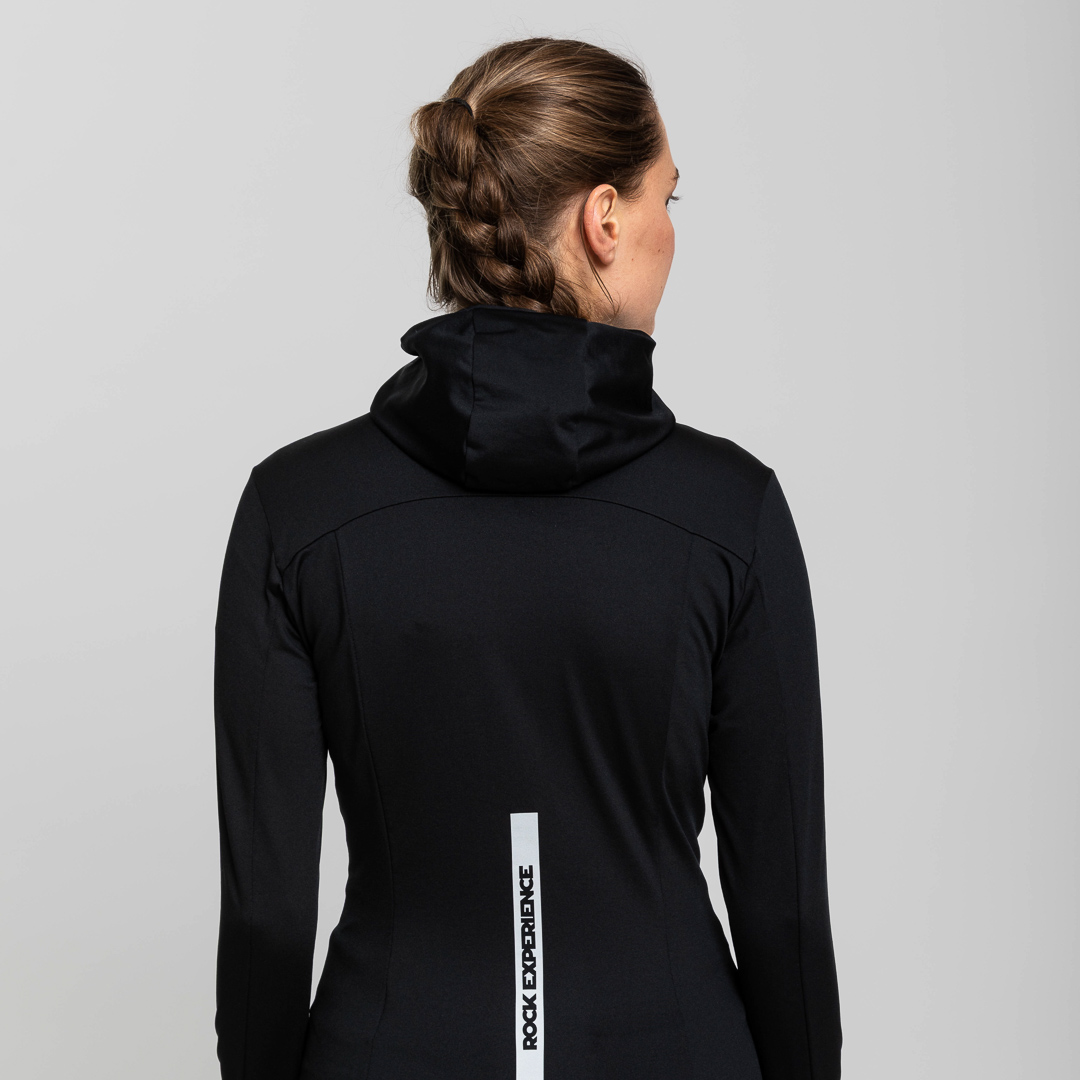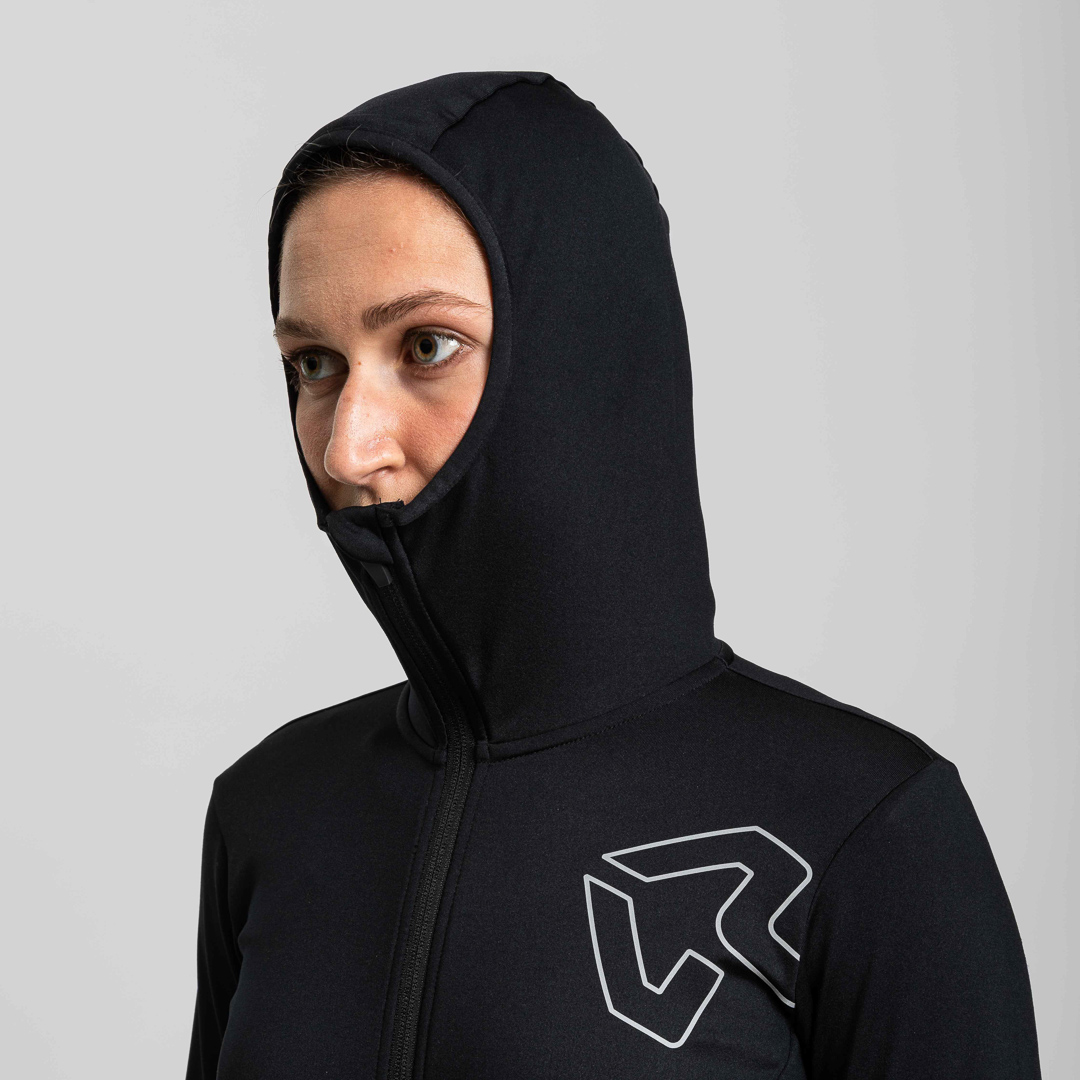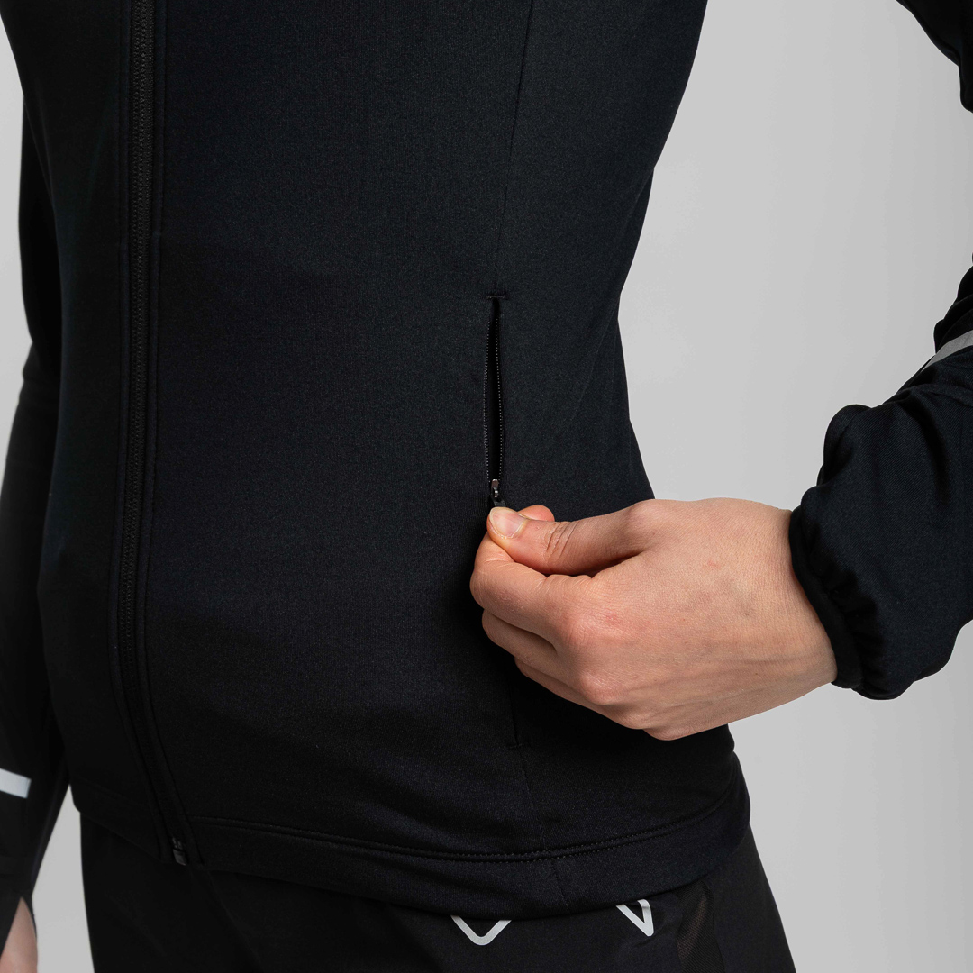 Il cappuccio, il fondo e le maniche inferiori sono rifiniti con nastro in lycra, assicurando una vestibilità aderente e senza restrizioni. La zip con cursore autolock garantisce una chiusura rapida e sicura durante i movimenti intensi.