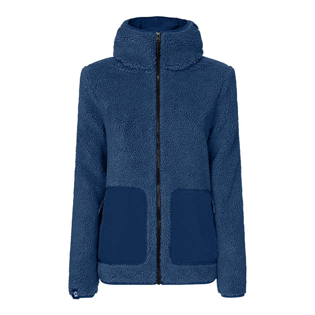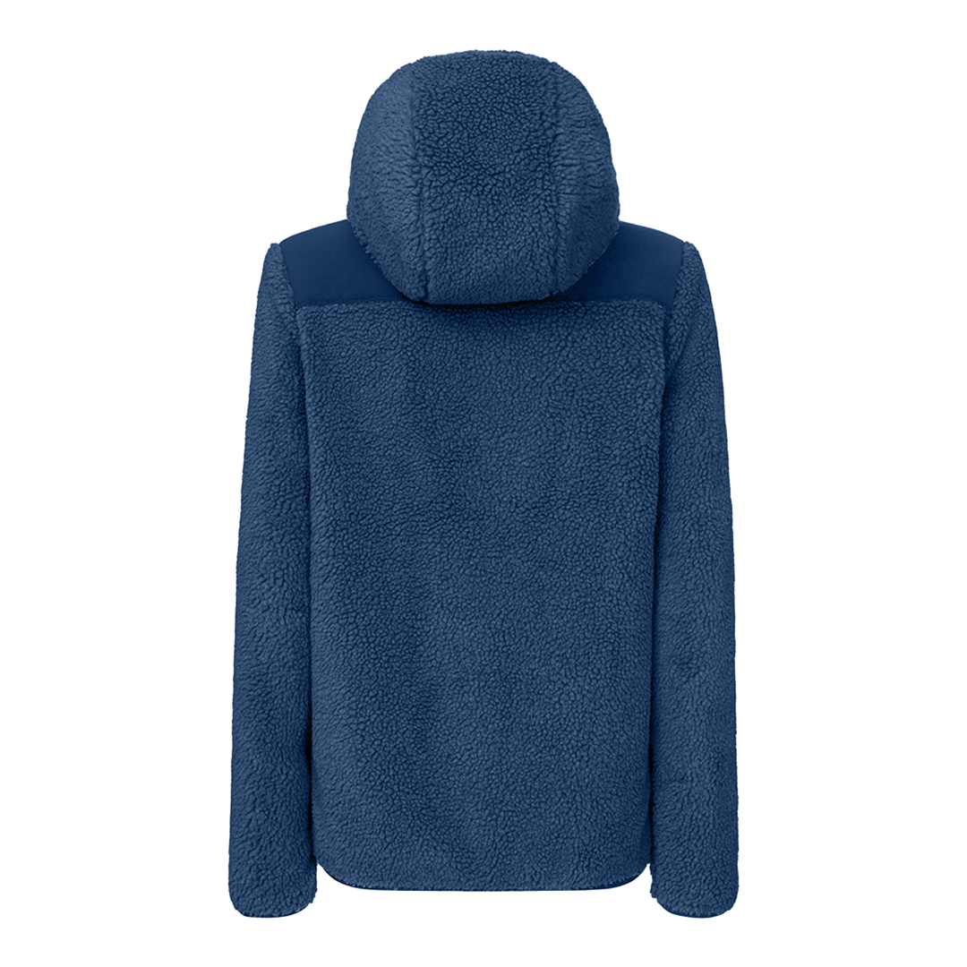 Il pile sherpa riciclato Re.Moose Pass presenta un rinforzo in tessuto tecnico protettivo su spalle e tasche. Nastro in lycra su cappuccio, fondo capo e fondo manica.