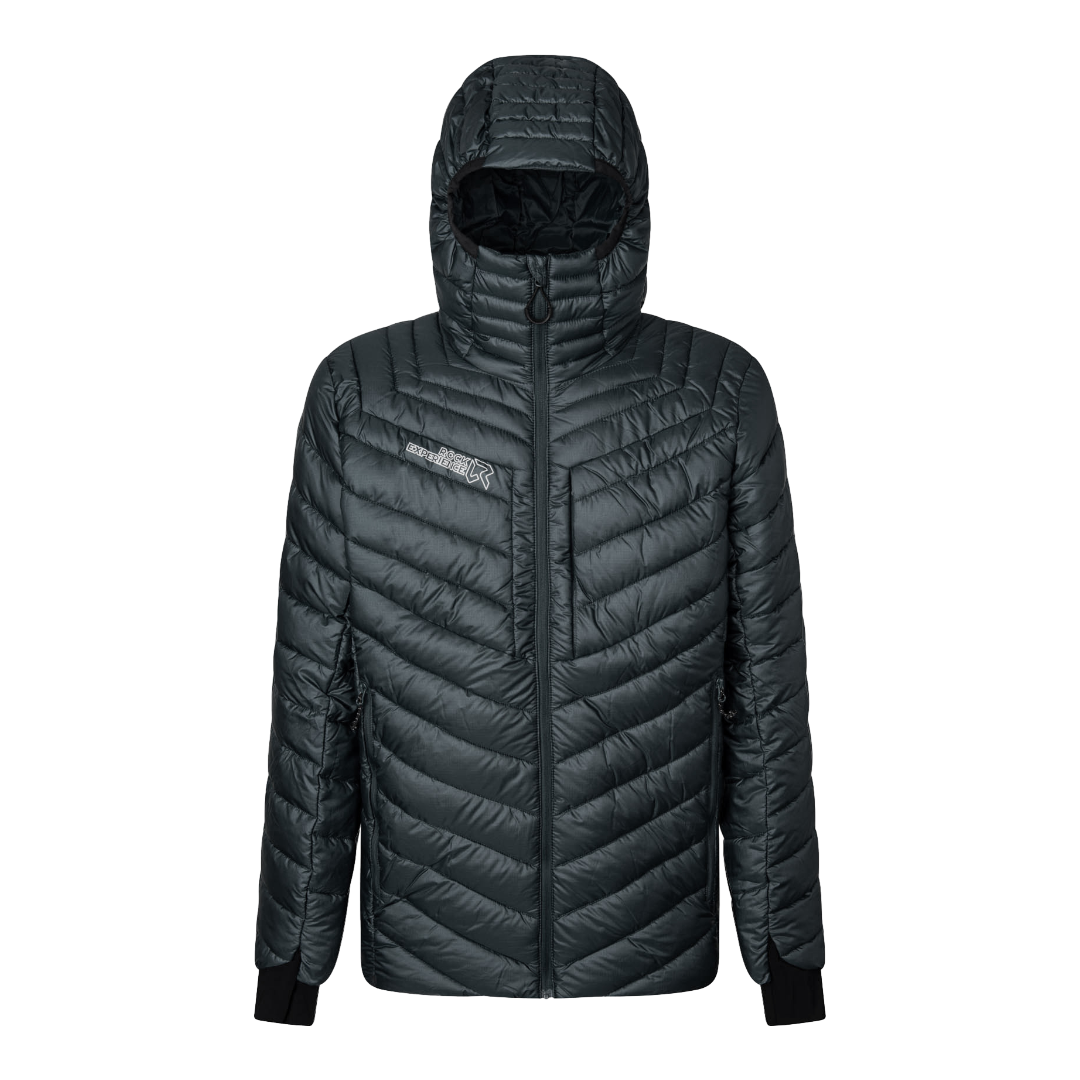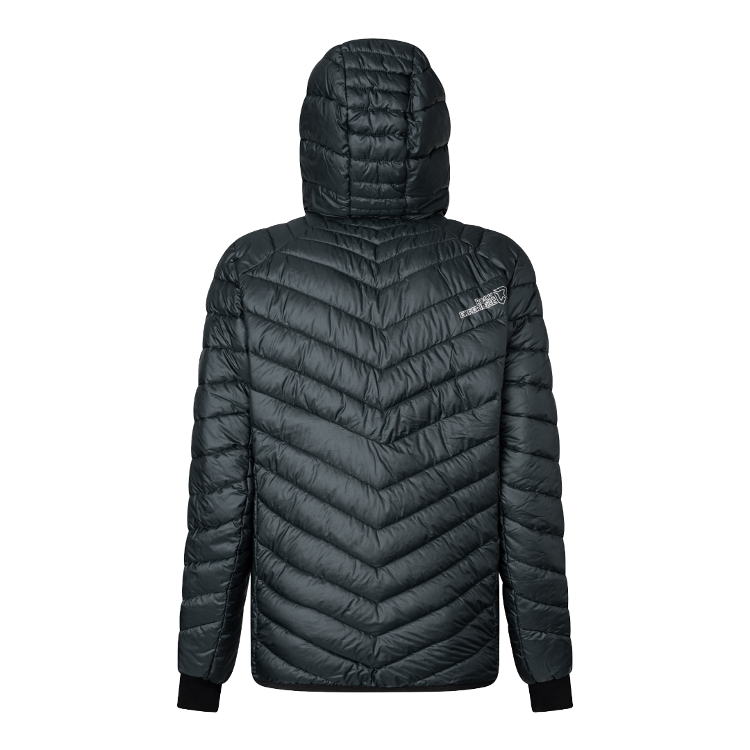 Il tessuto esterno è invece un poly ripstop riciclato con trattamento Water Repellent. È quindi molto robusto se viene in contatto con roccia o neve e lascia scivolare via gocce d'acqua e umidità ostacolandone così il contatto con l'imbottitura interna.