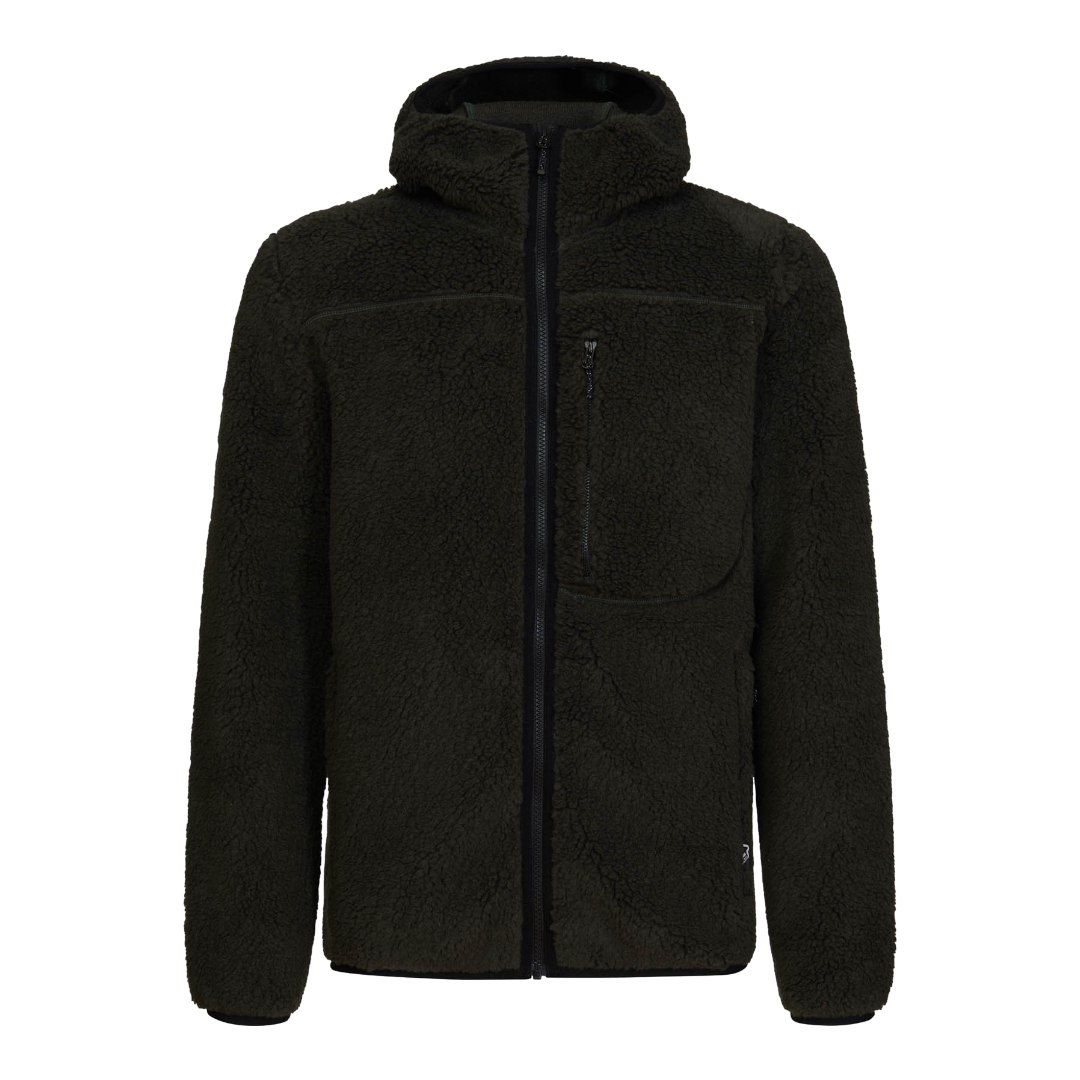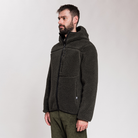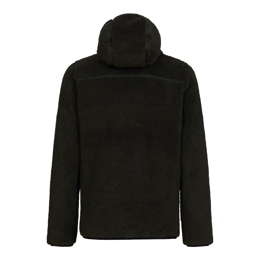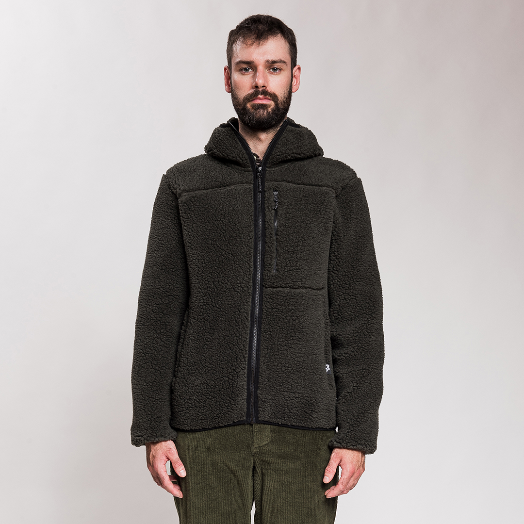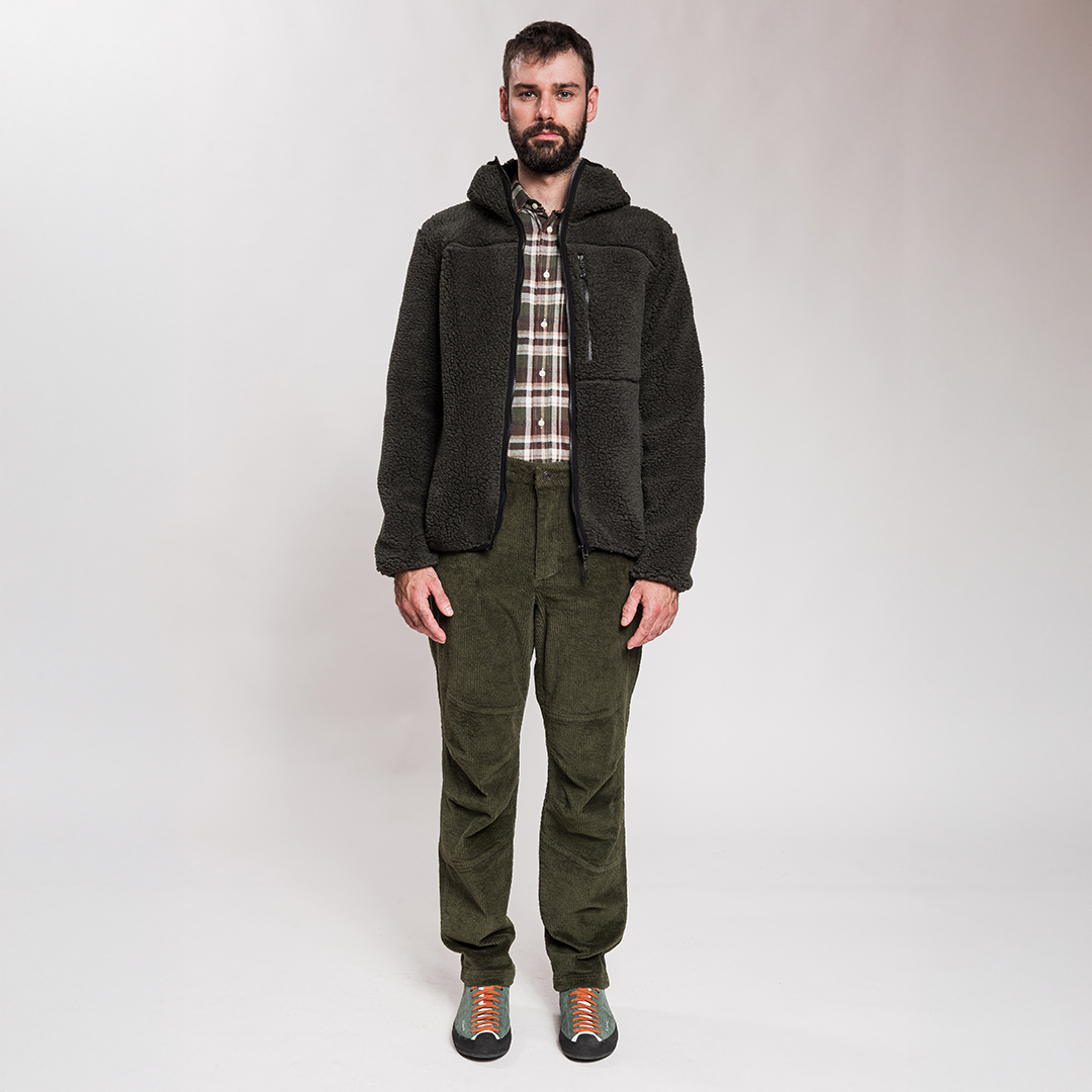 La parte frontale è realizzata in jacquard sherpa pile rinforzato con materiale tecnico antivento sul petto, la parte superiore della schiena e il colletto, assicurando resistenza agli agenti atmosferici durante le avventure outdoor.