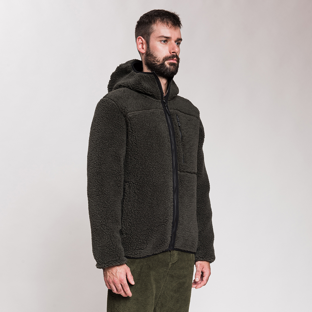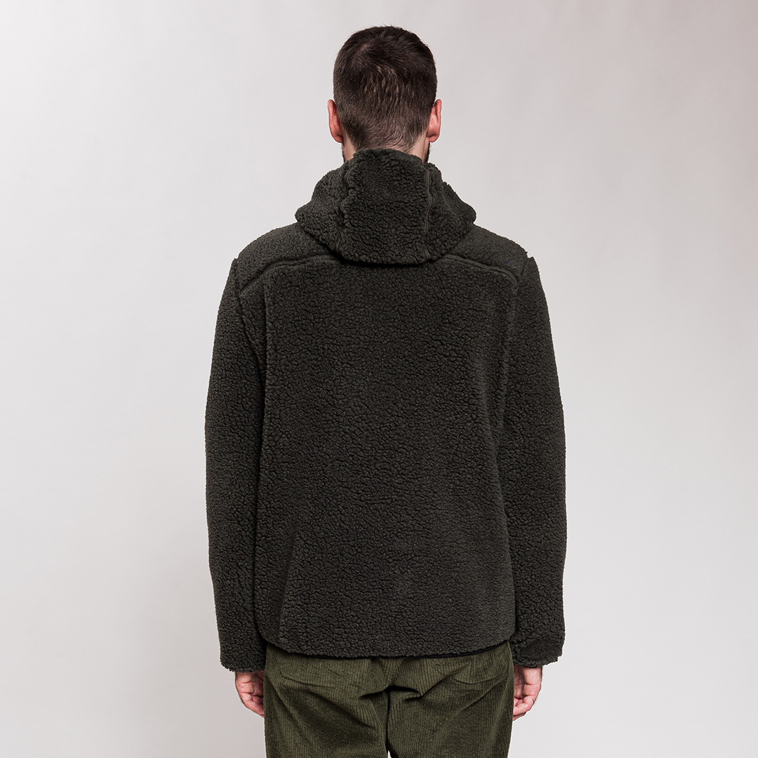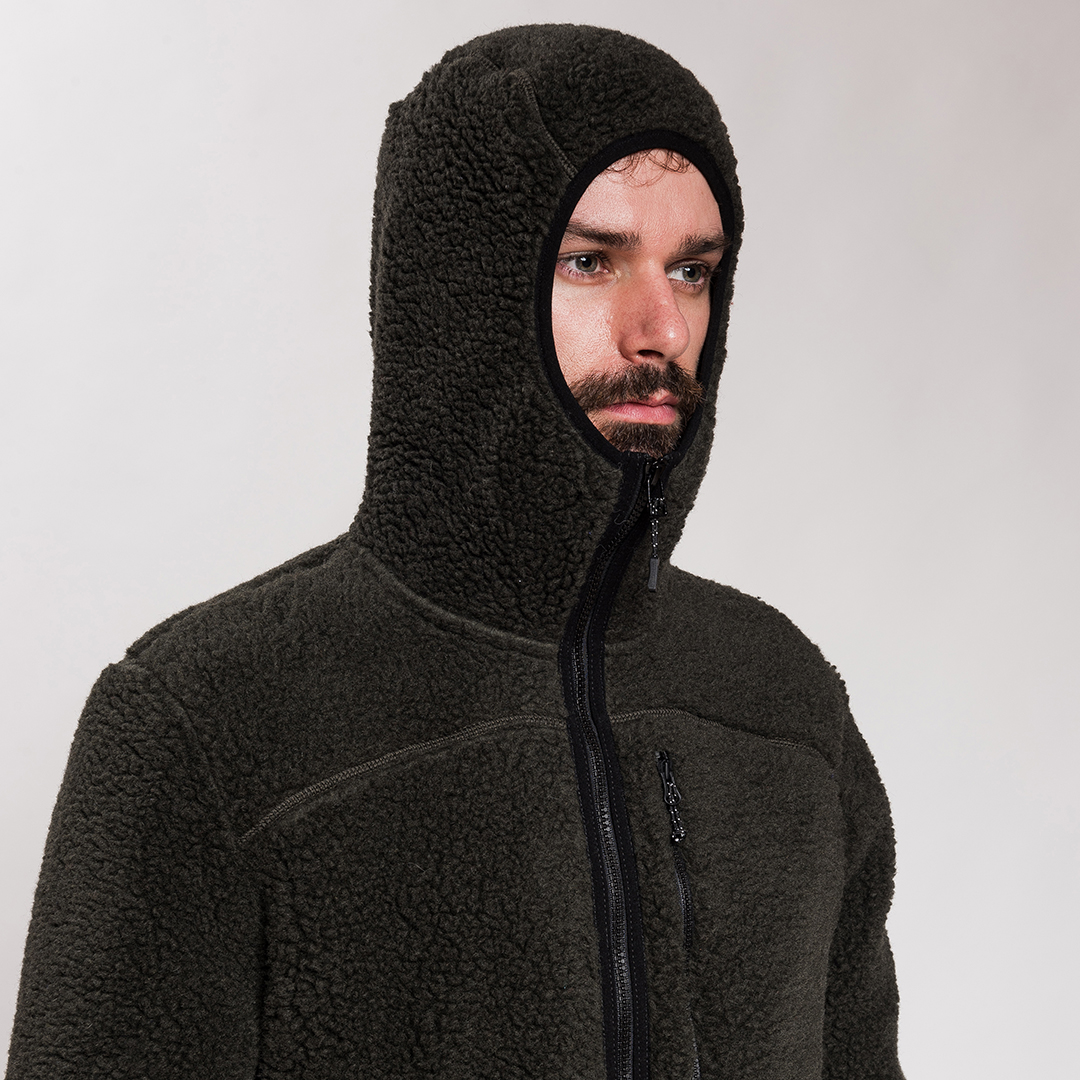 - Parte frontale in jacquard sherpa pile rinforzato con materiale tecnico antivento su petto, schiena superiore e colletto