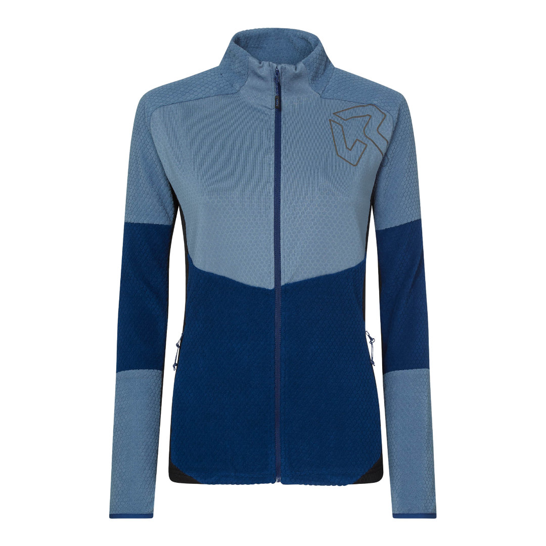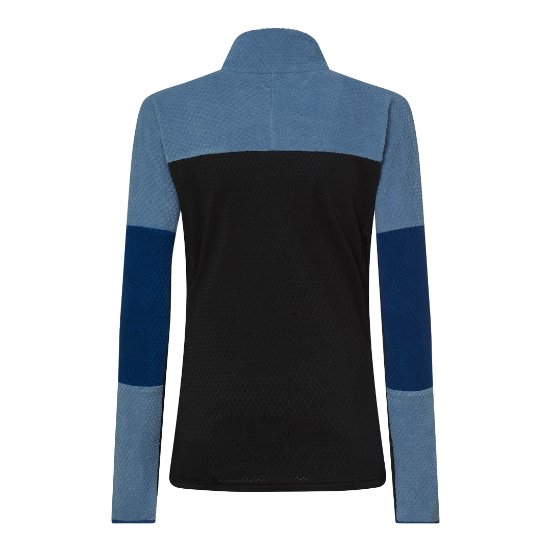 Edna è un pile a motivo esagonale in rilievo, sia interno che esterno al capo, per intrappolare il calore e allontanare l'umidità. Le cuciture sono piatte per evitare spessori e un nastro in lycra sul fondo manica lascia il pile sempre aderente al corpo.