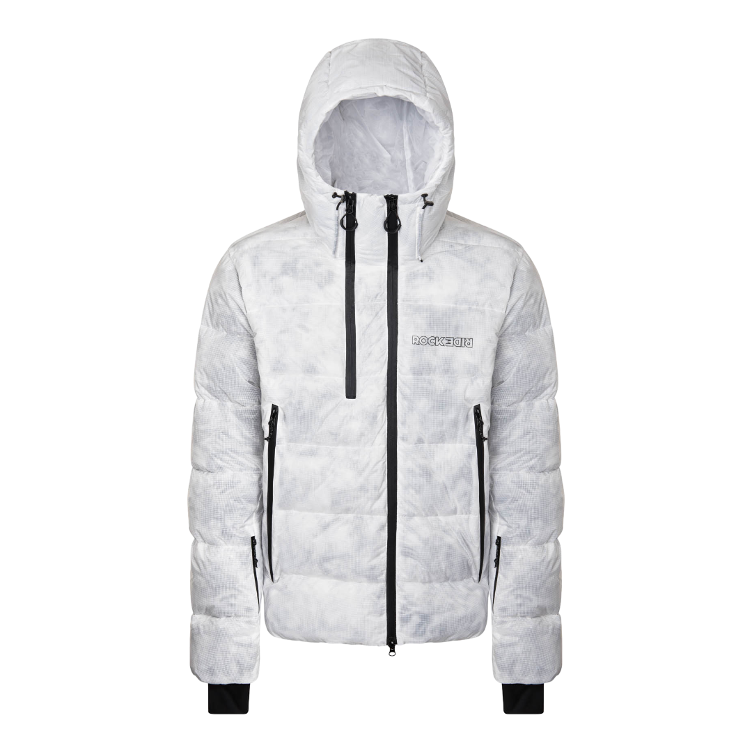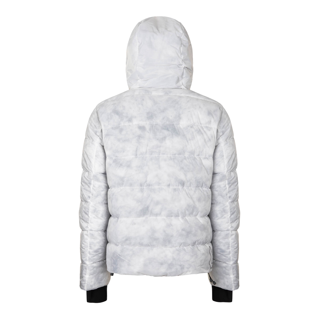 Il tessuto esterno in nylon ripstop trasparente WR PFC Free mette in risalto l’effetto marmorizzato dell’imbottitura, conferendo un look distintivo. La chiusura con doppia zip e soffietto assicura protezione dagli agenti atmosferici, mentre il cappuccio regolabile, i polsini in doppia lycra e il fondo con cordino offrono vestibilità e comfort durante le discese invernali.