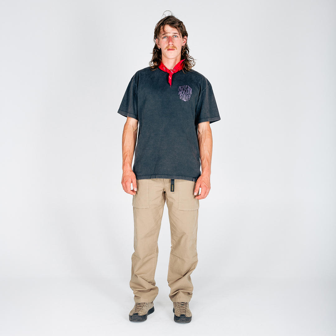 HAND è la t-shirt girocollo dal carattere vintage, definita dai trattamenti garment dyed e stone washed per tonalità autentiche e un effetto lived-in unico. Stampa “Spaghetti Boulder” sul petto per un tocco essenziale; sul retro, grafica “Hand” a tutta identità. Bridge label “Rock Experience” sul fondo come firma pulita. Il jersey cardato 20/2 da 270 gsm offre mano corposa, struttura e comfort quotidiano.