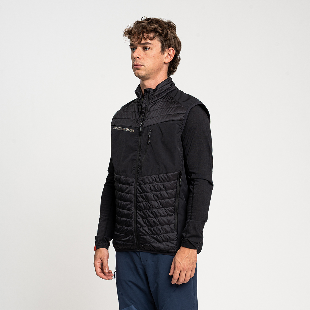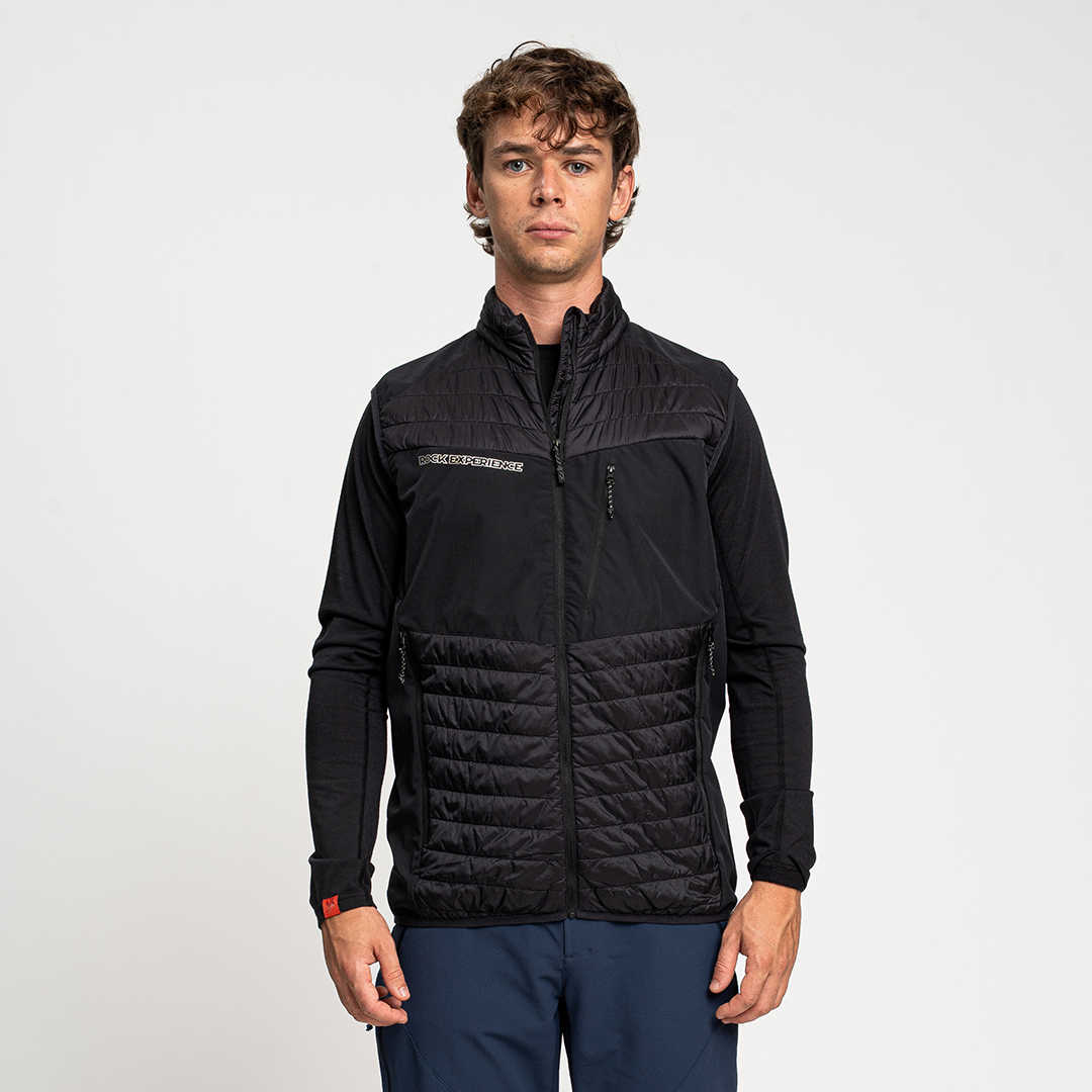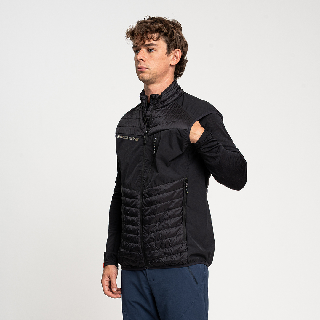 - Struttura ibrida con imbottitura leggera e inserti in nylon stretch su petto, spalle e pannelli laterali.