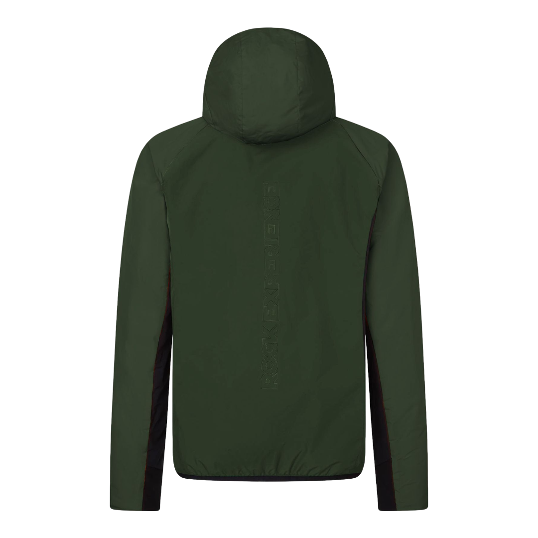 I pannelli laterali e sottomanica sono realizzati con tessuto 4 Ways Stretch per migliorare la libertà di movimento. Il cappuccio è integrato con calotta interna, ha una visiera rigida e una coulisse sul retro mentre una zip con cursore autolock personalizzata garantisce solidità durante le attività.