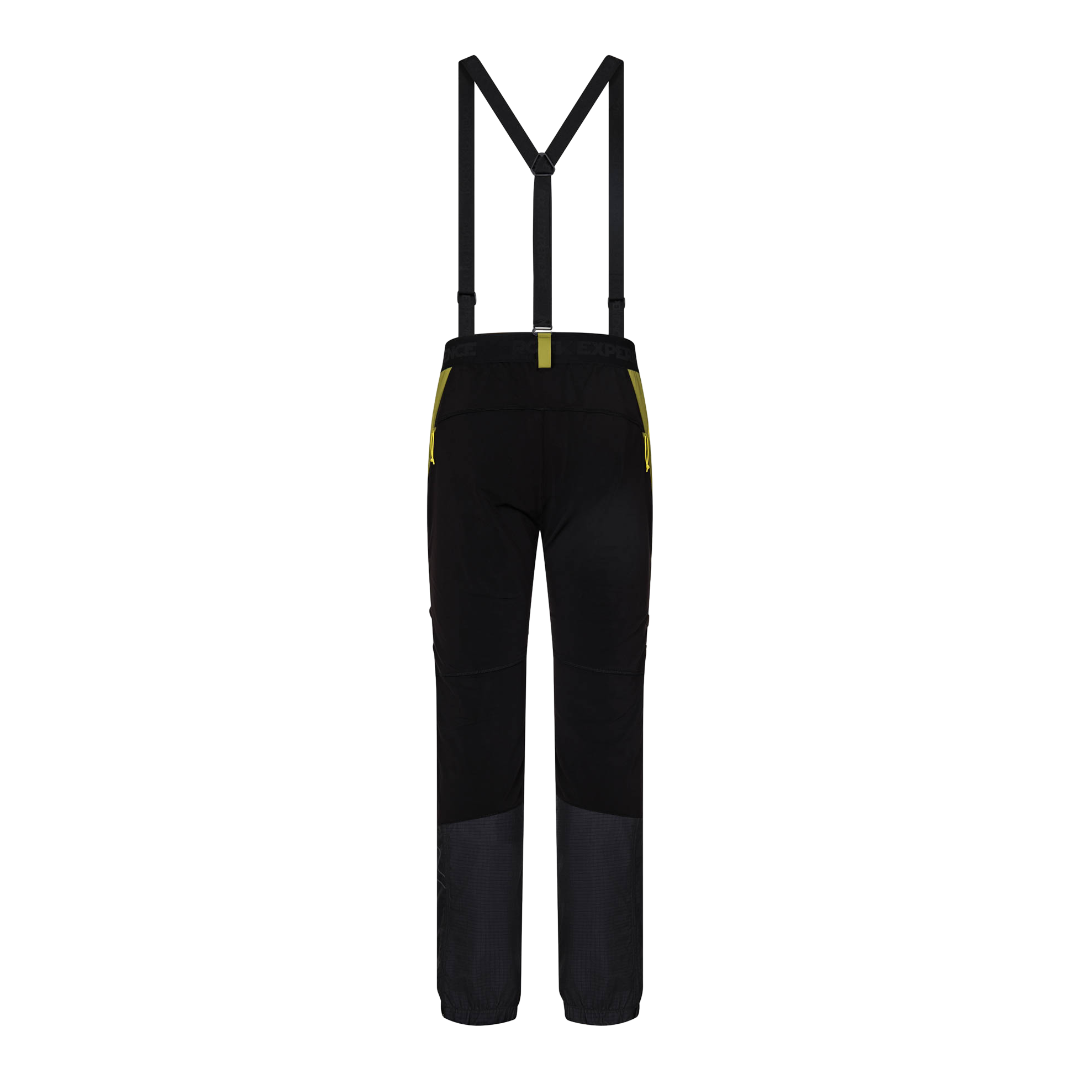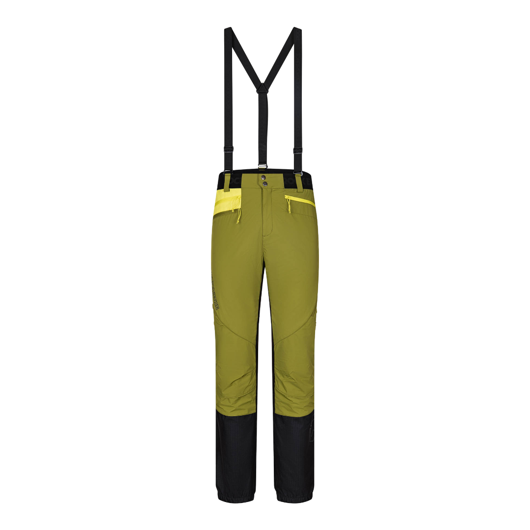 Sviluppato secondo il concetto di body mapping, combina materiali diversi per soddisfare le esigenze delle singole zone del corpo. La parte anteriore è protetta da un tessuto 2 strati WR antivento e idrorepellente, mentre il retro in lycra garzata garantisce libertà di movimento e massima traspirabilità. Il fondo gamba è rinforzato con un tessuto 3 strati ripstop ultra resistente alle abrasioni e impermeabile fino a 10.000 mm.