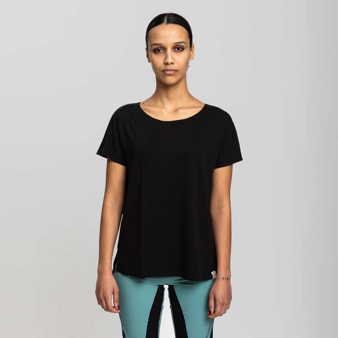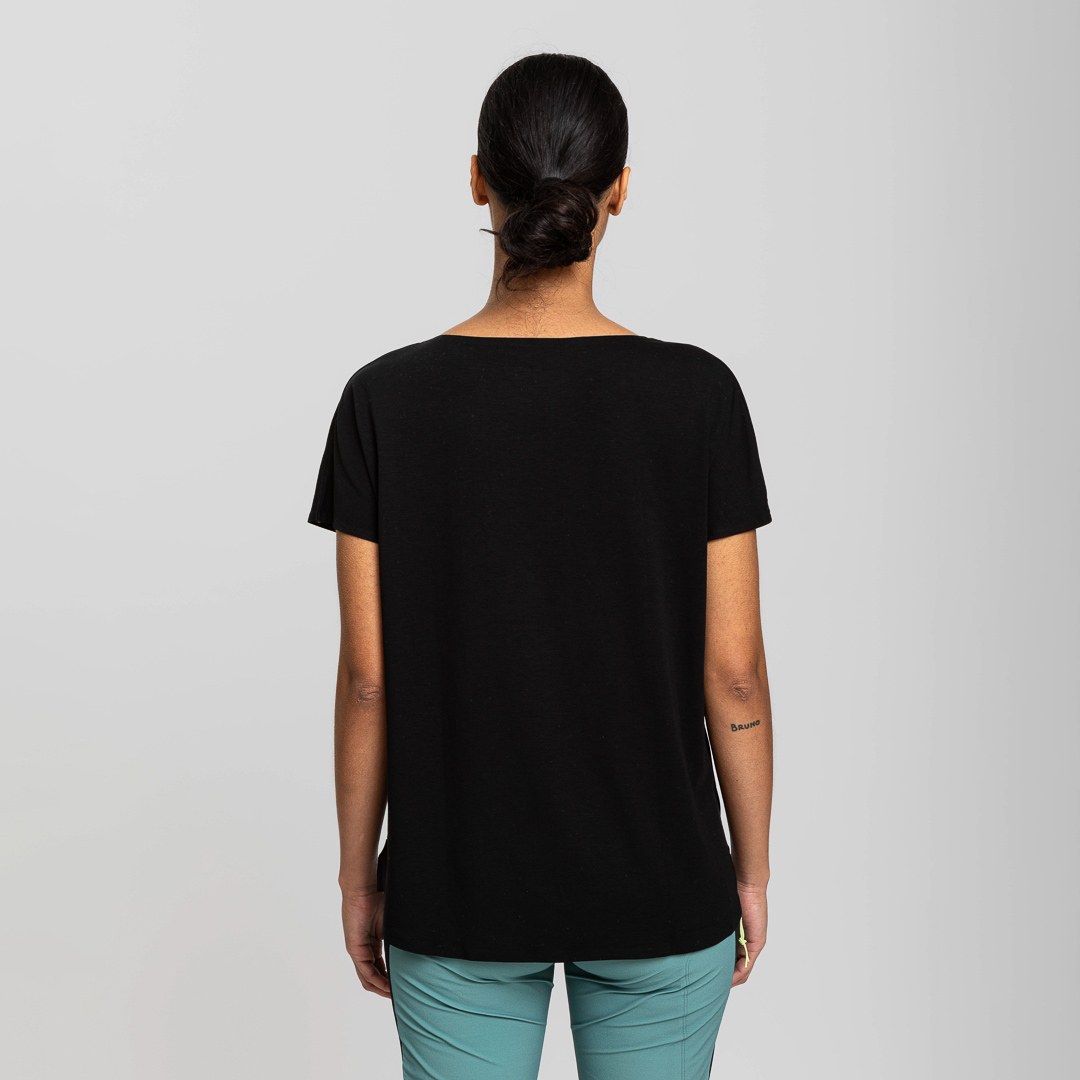 La T-shirt da donna Echo Wall è pensata per un'esperienza outdoor senza compromessi. Il suo concetto si basa sull'unione di fibre Tencel che garantiscono leggerezza ed estrema comodità. Con uno stile che abbraccia la libertà di movimento, il suo ampio scollo a barca e la vestibilità oversize la rendono un capo dinamico e versatile, ideale per avventure in montagna o momenti di relax.